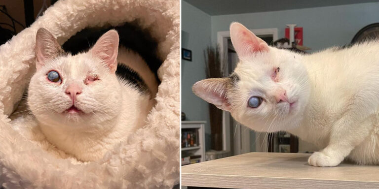 At the time, Ollie and his siblings were two weeks old and needed round-the-clock bottle feeding. Unfortunately, his eyes never developed fully, and he was blind from birth. Later, a veterinarian diagnosed a congenital condition called microphthalmia in the left eye. Furthermore, he had anterior segment dysgenesis with adherent leukoma in his right eye. As you can see, the eye appears like a “galaxy” of colors.