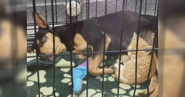 Touching Story: Stray Kitten Sneaks Out Of Crate To Take Care Of A Sick Dog
