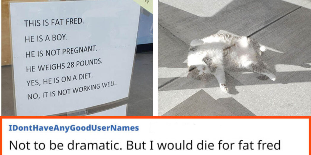 Imgur user KneeApallingTanIceCream was minding his p’s and q’s when he paused to read a sign posted by a vet clinic local to his community. The sign was absolutely hilarious and it’s goal was to introduce Fat Fred, a cat, and sooth the concerns of citizens who worried about how utterly enormous Fat Fred was.
