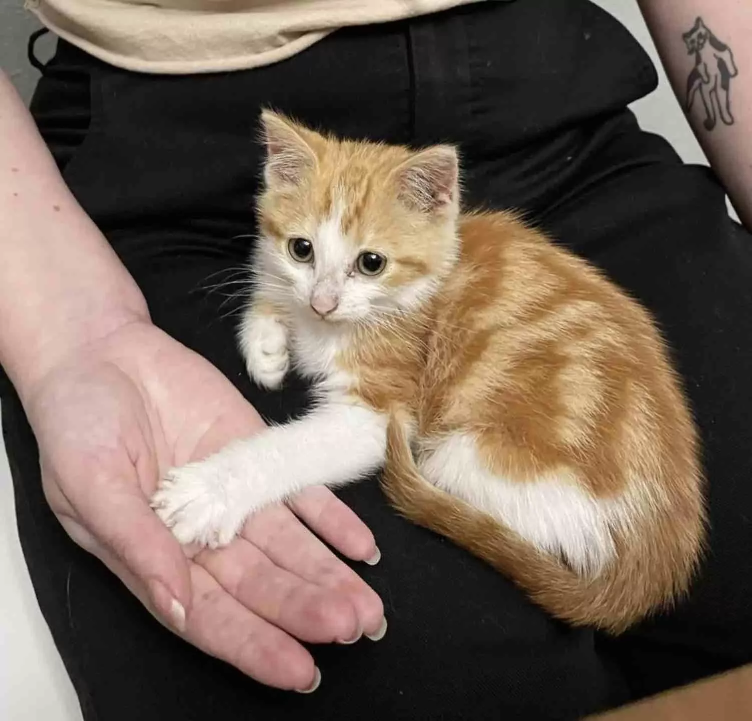 Garfield the kitten arrived at the shelter when he was five weeks old after a good Samaritan found him alone on the street. He was all skin and bones, covered in fleas, and had ear mites.