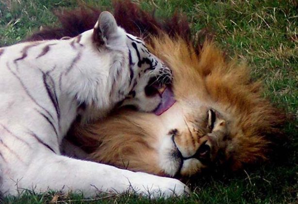 Leon and Tigress have been together since being rescued from a zoo. Cameron, a lion, and Zabu, a female white tiger, are an odd couple that cannot be parted. They reside at Big Cat Rescue and have a touching narrative.