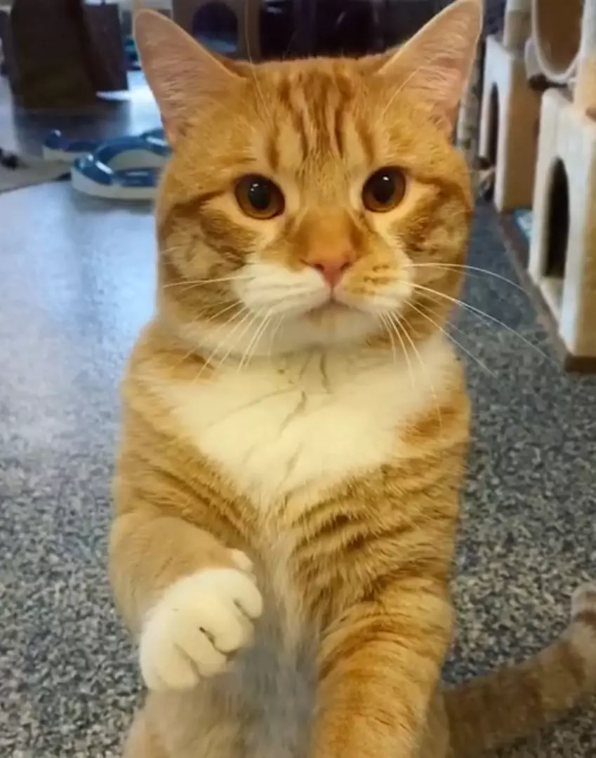 At the shelter a Cat welcomes visitors and hopes that someone would drive him home