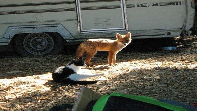 Vixey isn’t your typical wild fox. She has actually befriended a group of cats and shares dinner with them every day!