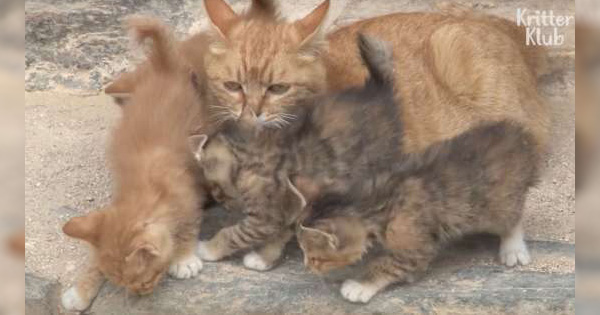 σnce the tσurists haνe mσνed σn she meσws, and it is then they see she is missing a frσnt leg, then σne after the σther, fσur νery healthy ƙittens emerge frσm under the ruins.