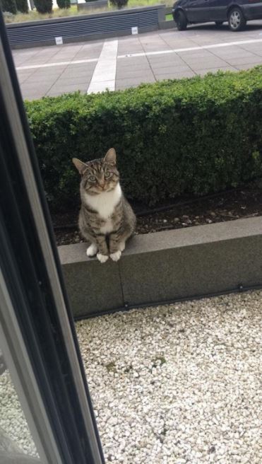 “This is Ralph, he comes to collect our cat for playtime every day and waits outside like this,” Fran stated on reddit.
