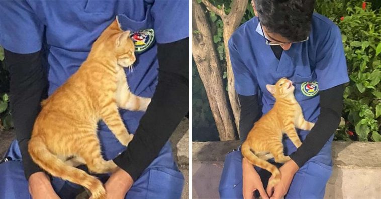 Flaty was sitting outside the hospital with his friend and colleague when a little stray kitty walked up to him, climbed onto his lap, curled up, and fell asleep.