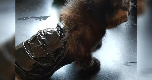 They found a kitten wrapped in a leash duct tape on the way. The heartless people wanted to see the poor animal run away from the dogs and ferrets, so they tortured the cat in that way. Fortunately, the kitten was promptly noticed and helped.