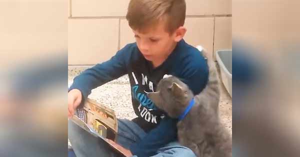 Boy visits Animal Shelter To practice Reading Skills, But Needy Cat Has other Ideas.