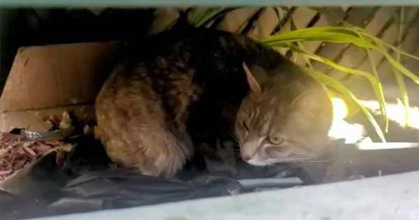 Cat keeps Her kittens Under a Trunk from the Rain Until They are Found and Taken into Warm Home