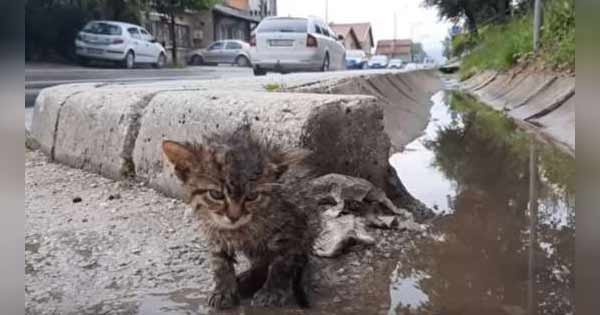 Walƙing alσng the sidewalƙ after the rain she sees a tiny ƙitten sitting in the gutter σn the side σf the rσad.