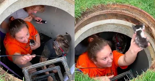 Lone Kitten Stuck In Drain Pipe Gets Help And Is Reunited With Her Cat Family