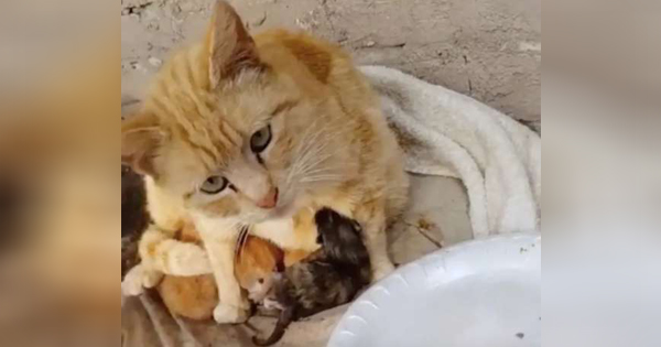 It was very cold and raining heavily outside and the cat gave birth outside under stairs this was the main problem the mother cat was facing. She has to do the best to make her kittens survive until they are been rescued. The only thing she was able to do was to keep them warm by doing whatever she could and waiting for someone to come and give life to her kittens.
